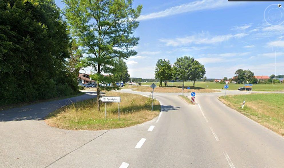 Bitte beachten Sie die unscheinbare, aber mit dem Richtungsschild 'Sportplatz' ausgewiesene Einfahrt zum Vereinsheim direkt hinter dem Kreisverkehr in Richtung Egling!